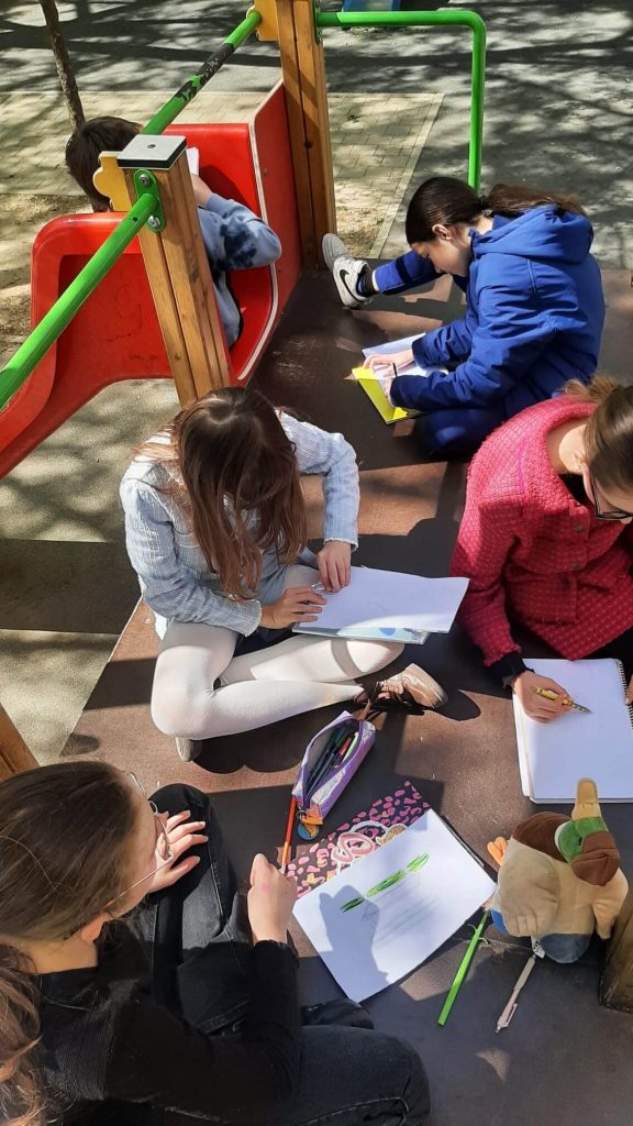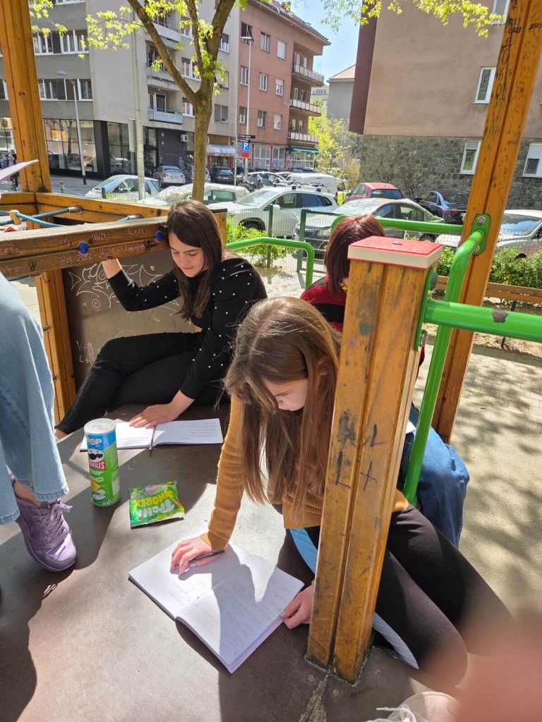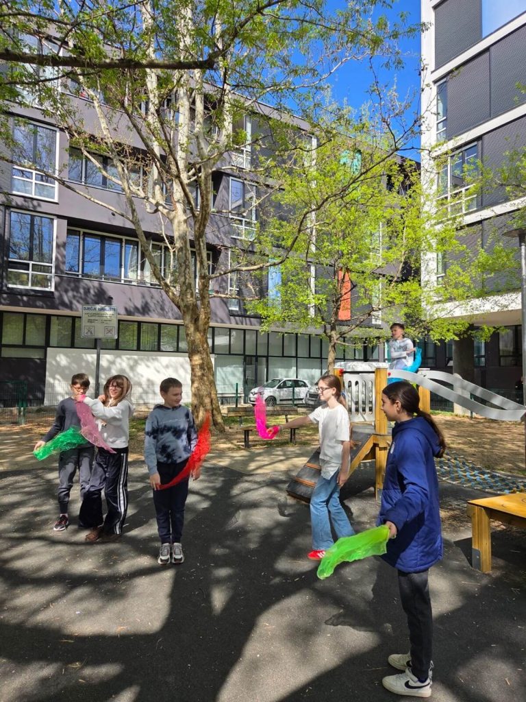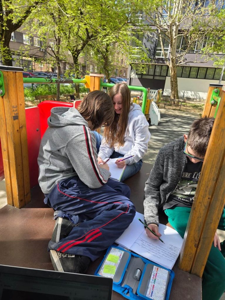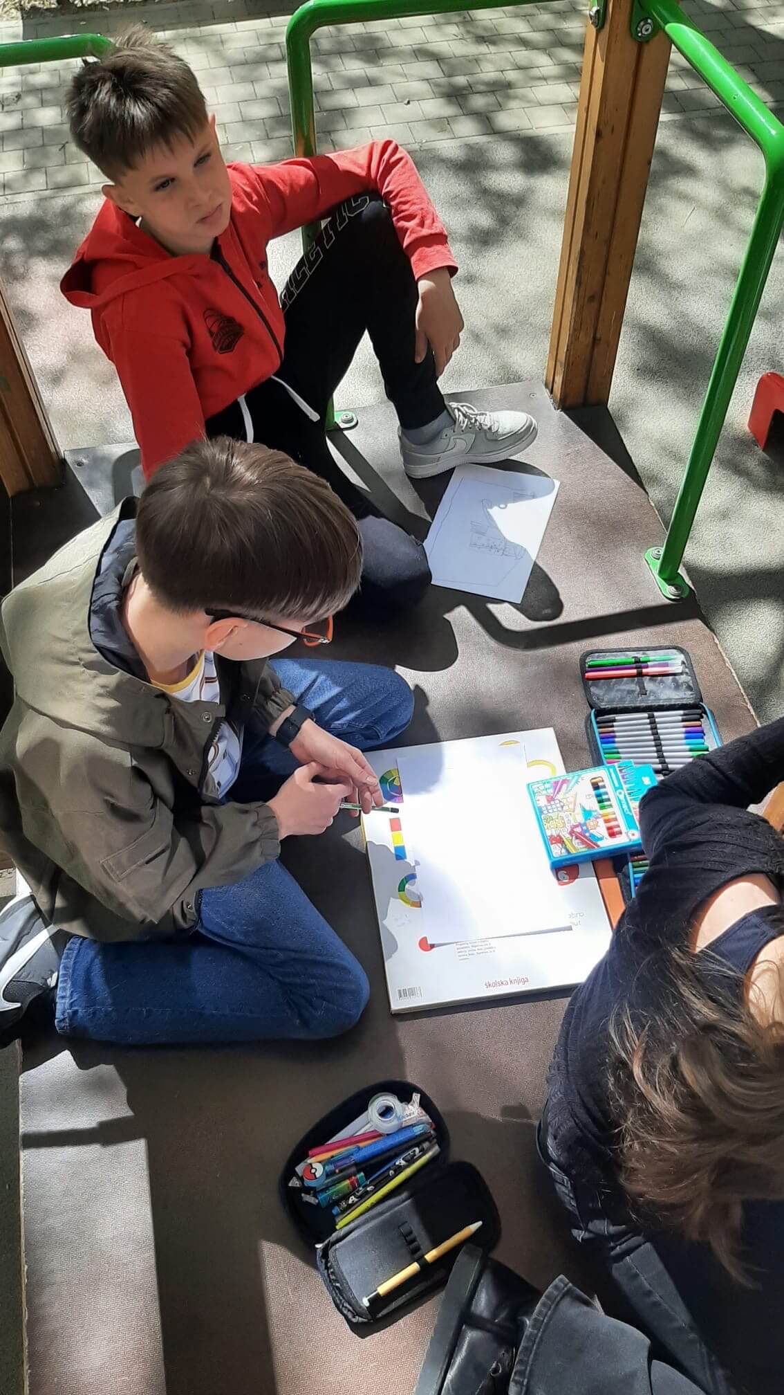 Proljetno sunce izmamilo je učenike i profesore naše škole da provedu nastavu na otvorenom u obližnjem parku. Učenici petog i šestog razreda uspješno su pisali, stvarali, slušali glazbu i plesali u okviru nastave likovne i glazbene kulture. Promjena okoline i boravak na zraku potiču razvoj i primjenu kreativnosti i kreativnog razmišljanja u svakodnevnom radu i stvaranju, senzoričku prilagodbu na različite prostore, materijale, zvukove i mirise kojima su učenici okruženi te bolju društvenu komunikaciju i interakciju. Učenici su pronalazili različite načine korištenja izvanučioničkog prostora za sebe, ali i za plišane prijatelje poput patka Perice.